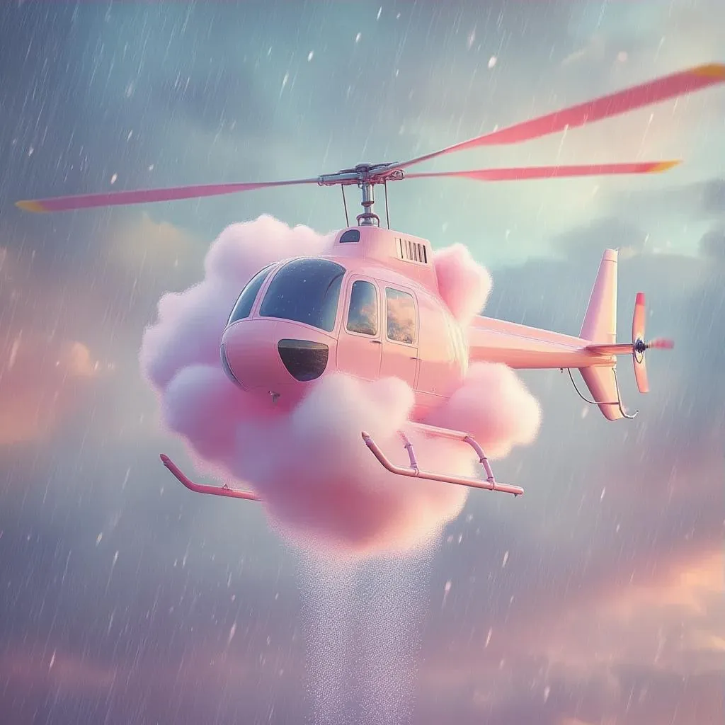 Create a whimsical AI-generated scene of a cotton candy helicopter dissolving mid-flight in the rain. Explore vivago.ai's AI effects to transform surreal concepts into vivid visuals, blending dreamy textures, playful colors, and dynamic weather elements for captivating, professional-grade creative content.