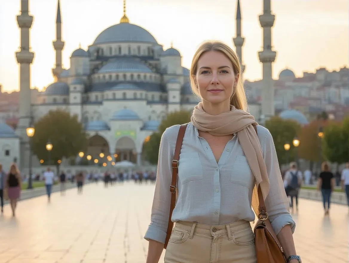 Vibrant travel portrait of a 40-year-old woman with sleek blonde hair at Istanbul's Blue Mosque during golden sunset. High-resolution Nikon D5300 shot captures soft wrinkles, beige jeans, grey linen blouse, and cultural details. Professional 50mm f/2.8 photography with blurred Ottoman domes, inspired by McCurry's iconic style. Perfect for AI-generated cultural imagery and hyper-detailed visual storytelling.