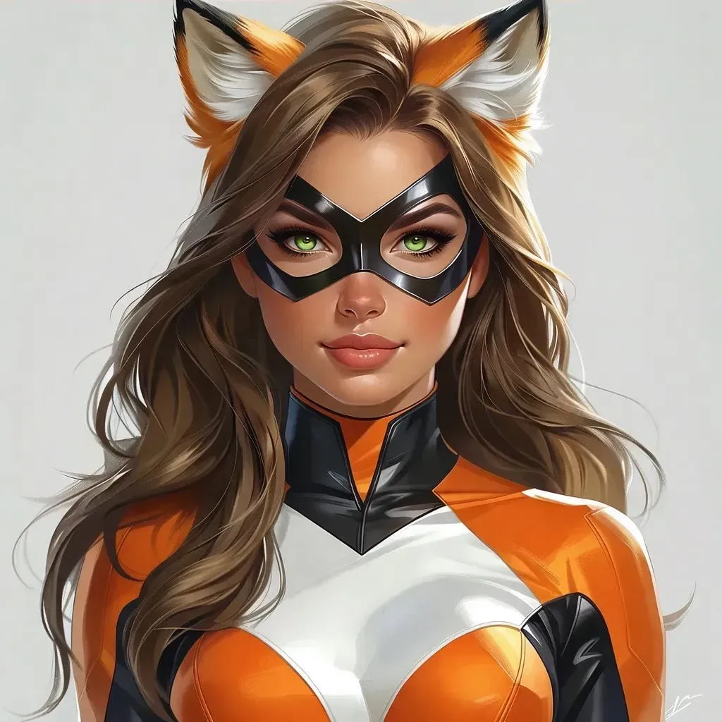 Generate an AI superhero from Miraculous Ladybug series featuring a fox-themed heroine with long brown hair, green eyes, and orange-black-white suit. Create vivid character art with precise traits: round face, high nose bridge, bright pupils. Perfect for fan art or content creation using vivago.ai's AI image generator for superhero designs.