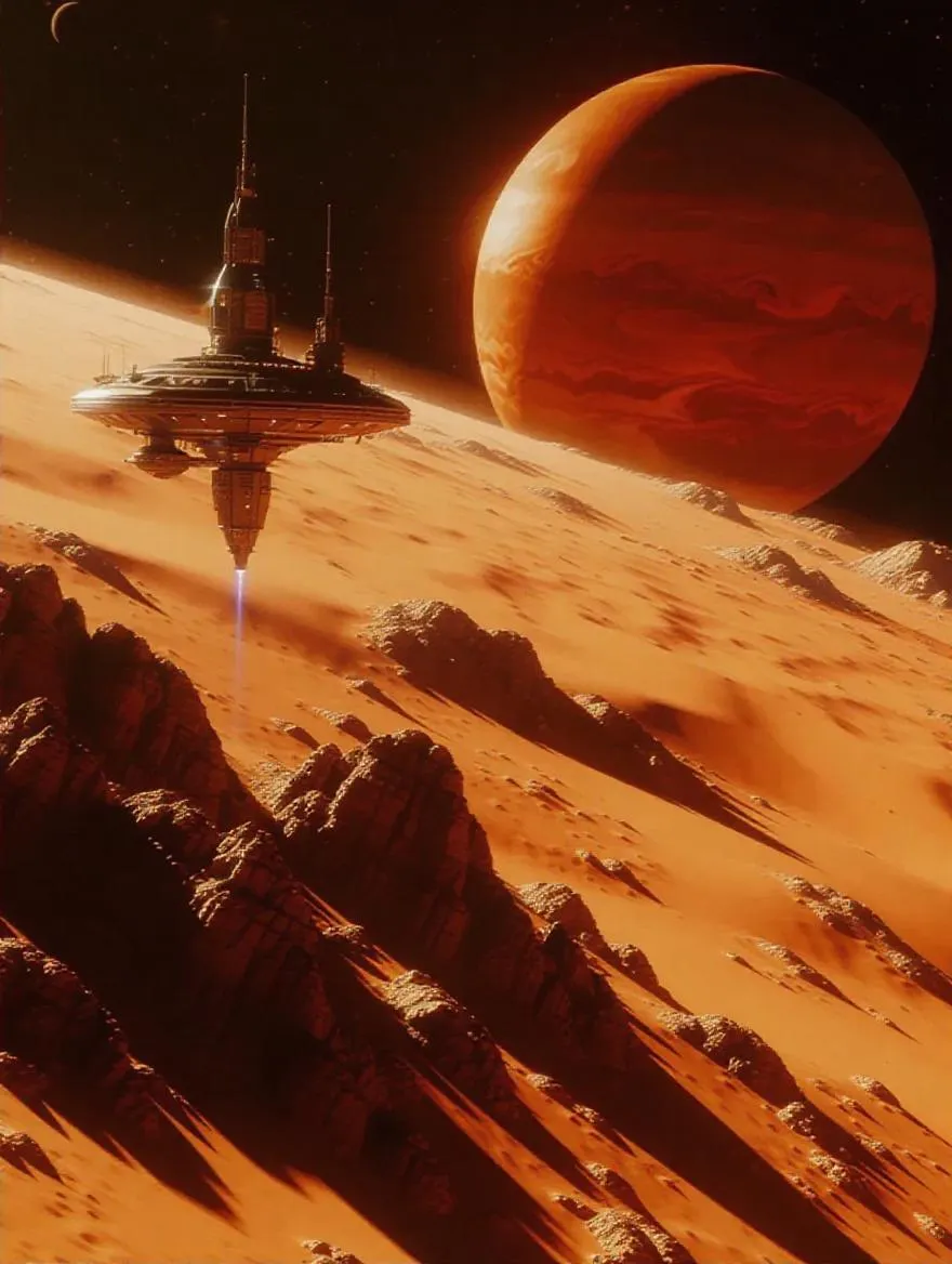 Sci fi Orbital Laser Platform (OLP) orbiting a desert planet. Large red gas giant in the background. Focus on the OLP and planet, no ships. Atmospheric lighting