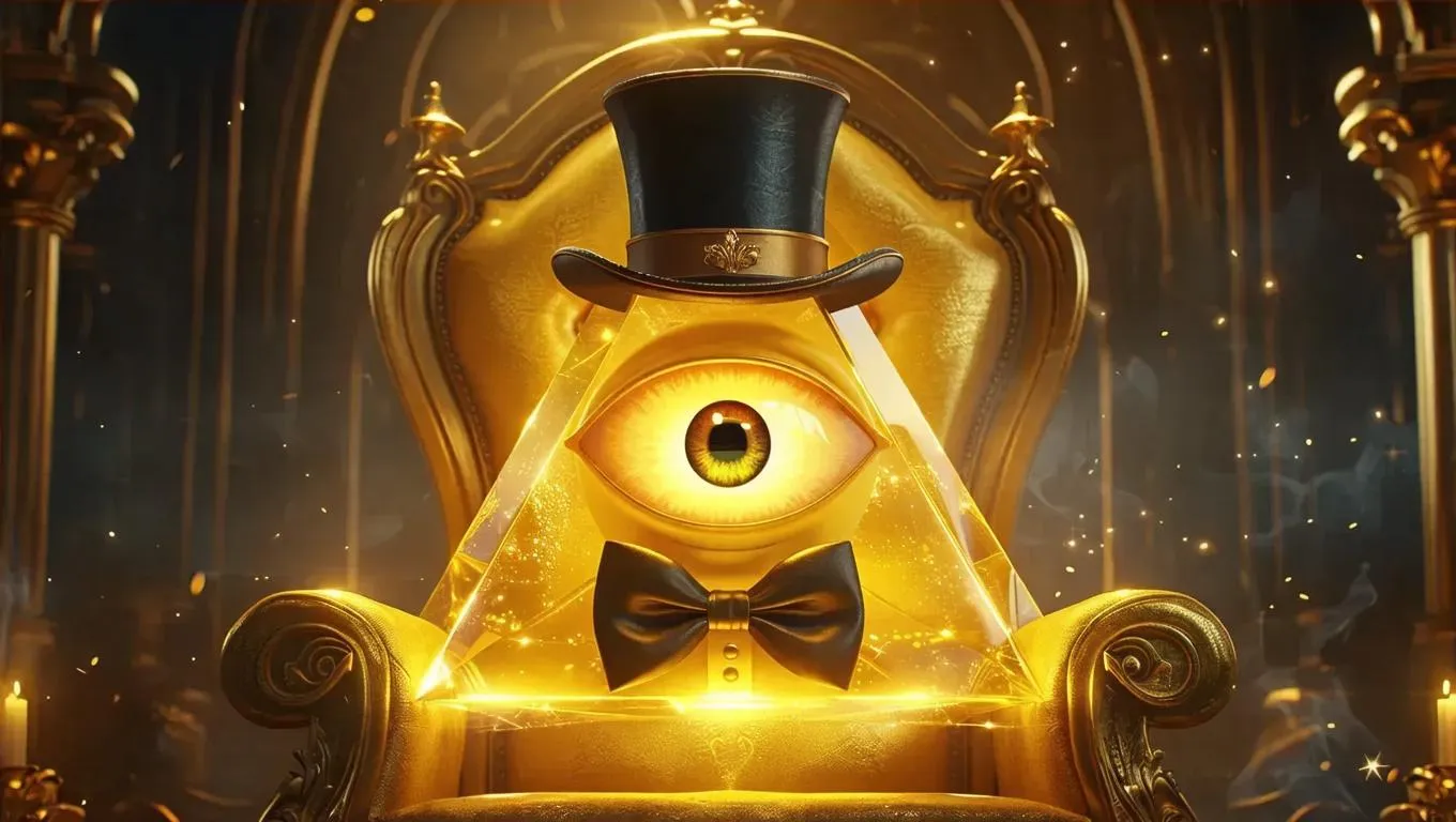 Create a whimsical Disney-style 2D AI-generated image of a charismatic yellow triangle with a glowing eye, bow tie, and floating top hat enthroned. Ideal for animations, storybook illustrations, or quirky character designs. Explore Vivago.ai's AI tools for magical, professional-grade anthropomorphic visuals with retro charm and imaginative details.