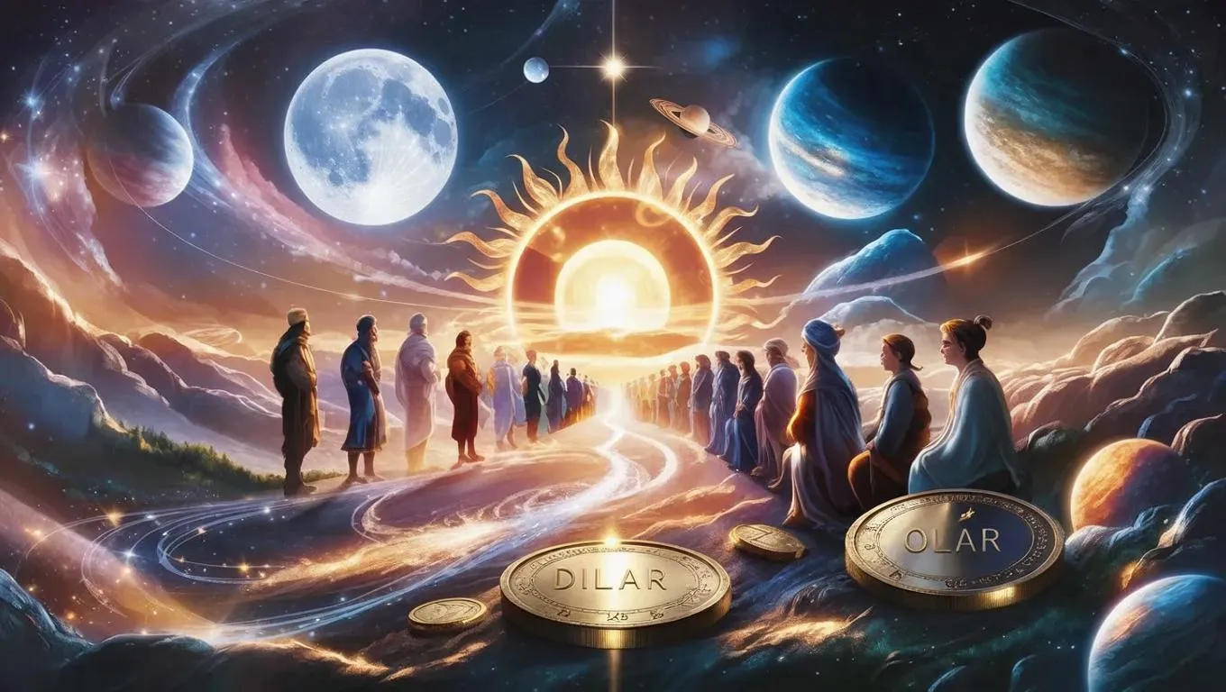 Create AI-generated surreal art with vivid celestial scenes: a sentient moon humming melodies, a patient golden sun in cosmic queues, and whimsical floating coins symbolizing time and money. Craft dreamlike visuals blending cosmic harmony, mystical whimsy, and playful symbolism using professional AI tools for enchanting, timeless storytelling.