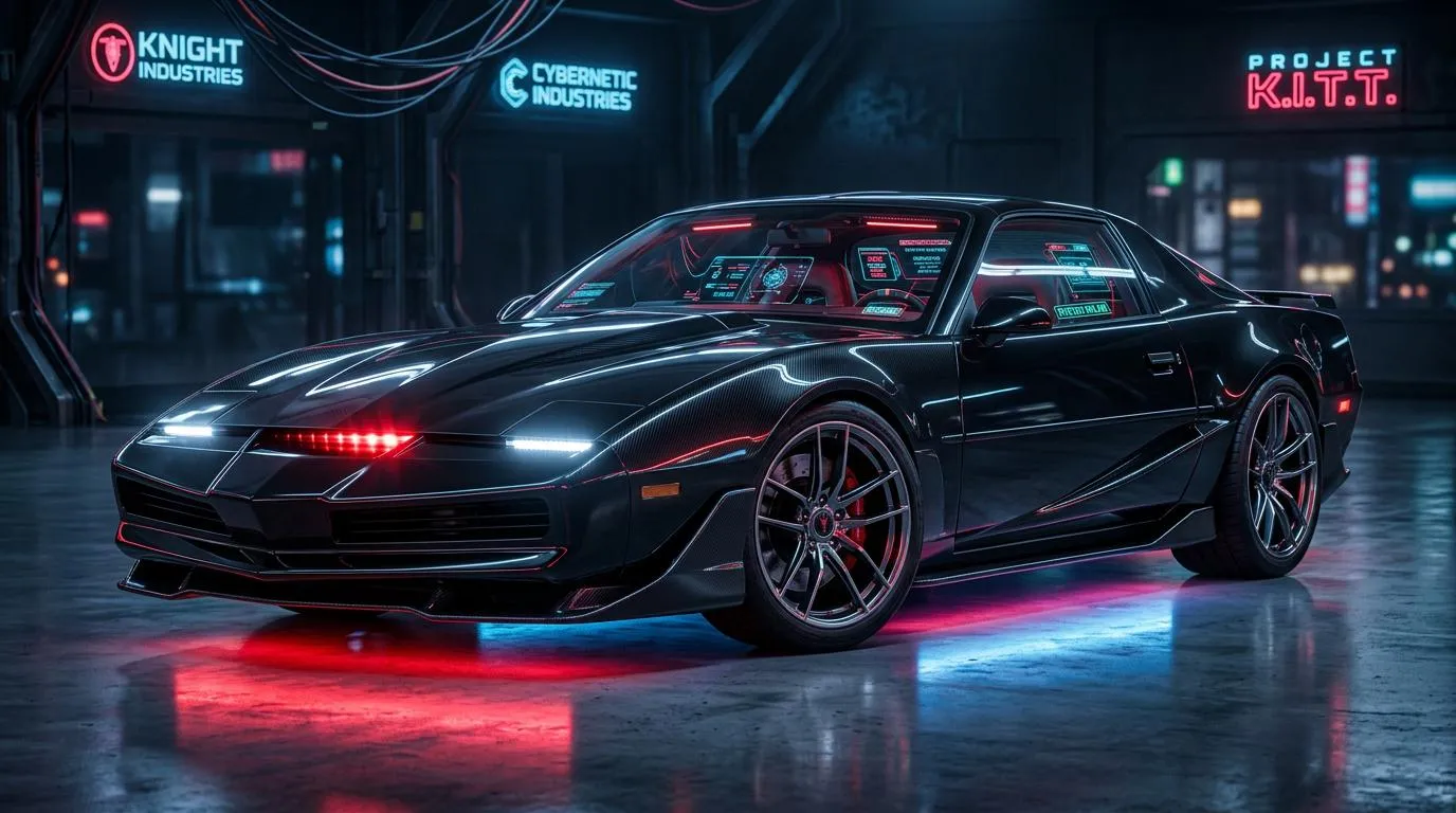 A futuristic upgraded Knight Rider KITT car, sleek black Pontiac Trans Am-inspired design, advanced aerodynamic body, glowing red LED scanner light on front bumper, dark tinted glass cockpit, carbon fiber details, neon underglow, chrome alloy wheels, cyberpunk lighting, dramatic studio lighting, highly detailed, 8K quality, automotive photography, concept car design, futuristic interior visible through windshield