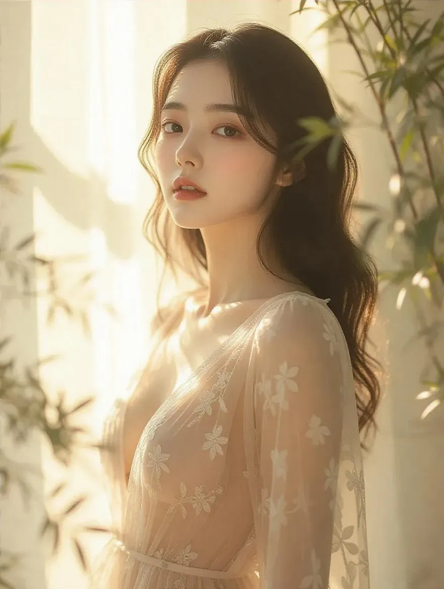 Create ethereal, photorealistic AI images of a woman in a sheer translucent outfit with soft lighting, dreamy blurred backgrounds, and graceful poses. Vivago.ai enhances fabric textures, natural skin tones, and sophisticated compositions using rule of thirds for balanced, artistic visuals with refined, tasteful elegance.