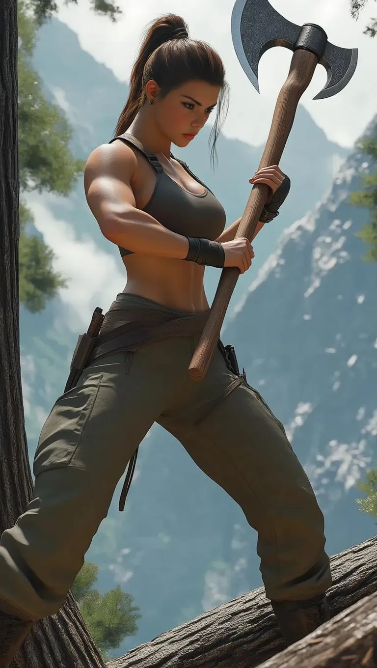 Create a cyberpunk game-style AI image of a muscular woman wielding a two-handed axe in rugged mountains. Features 8K resolution, partial anatomy details, and dynamic lighting for a futuristic lumberjack warrior aesthetic. Perfect for gaming visuals, concept art, and AI-generated cyberpunk character designs.