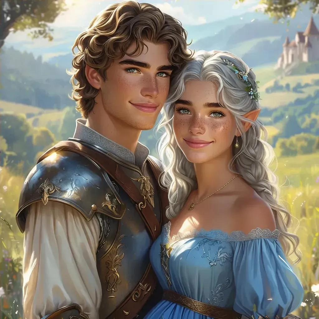Generate AI-powered medieval romance art: a 2m-tall warrior prince with curly brown hair and glowing eyes embraces his pregnant fairy love (silver hair, blue dress) in daylight. Perfect for fantasy storytelling, historical scenes, and character design using advanced AI effects like glowing eyeballs, curly textures, and lifelike details. Create epic, emotive visuals effortlessly.
