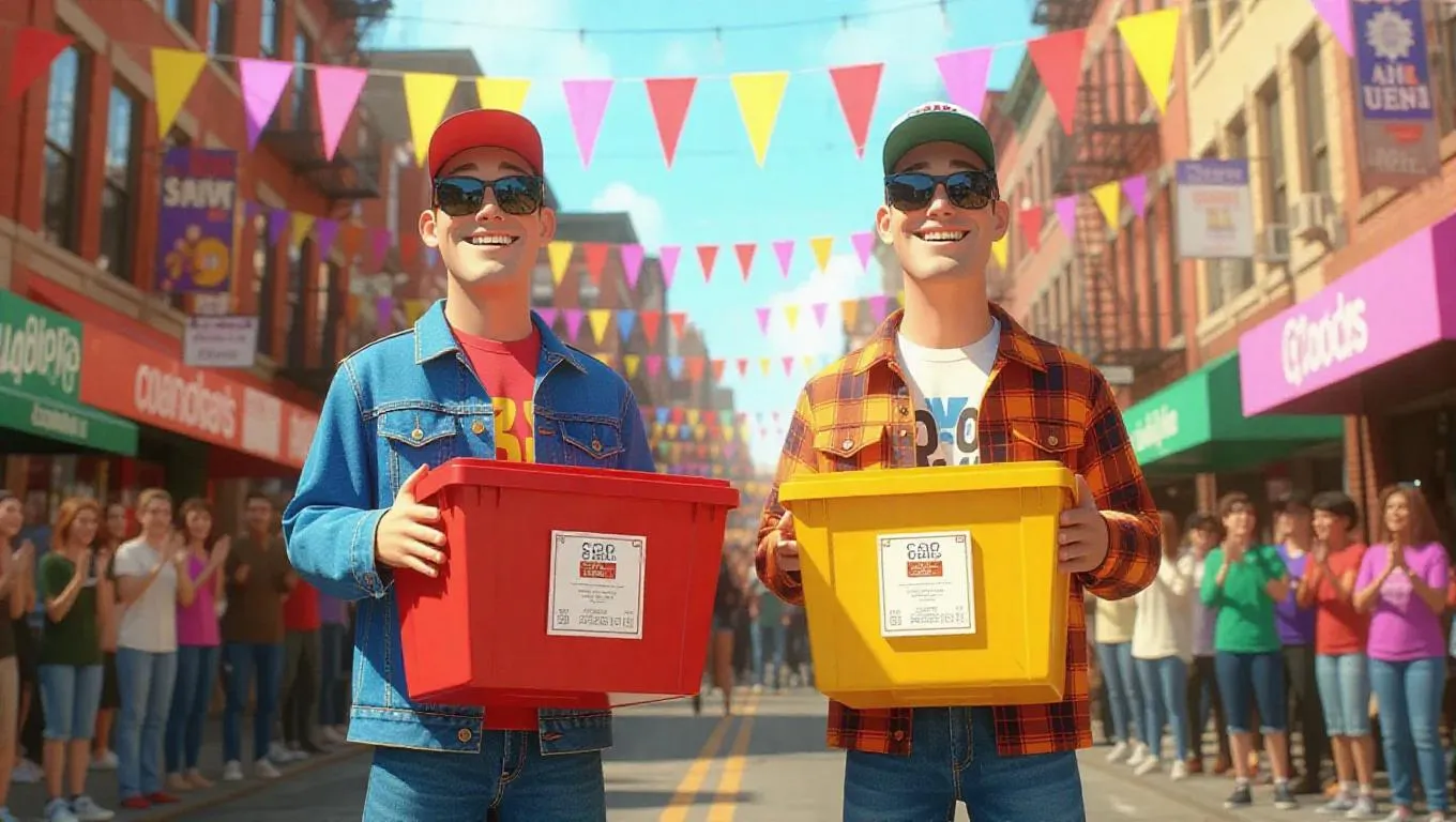 Beavis and Butt-Head, dressed in mismatched charity event attire, stand confidently on a bustling city street, surrounded by colorful banners and cheering crowds. They hold oversized donation boxes, grinning widely, embodying their quirky charm while promoting a heartwarming cause.