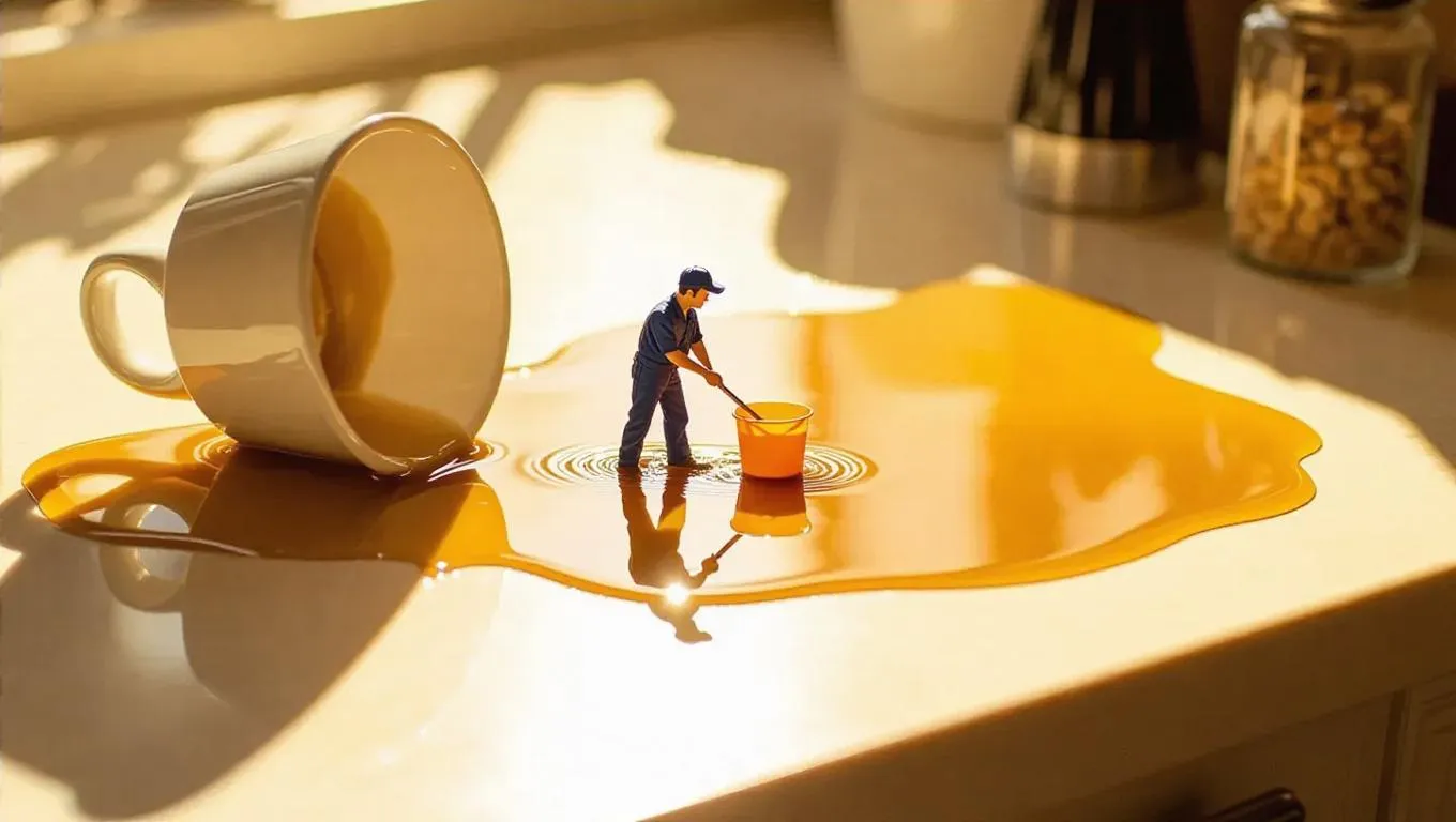 Create a surreal AI-generated scene with VivaGo: A miniature janitor cleans spilled coffee on a kitchen counter beside a giant overturned mug. Transform text prompts into vivid visuals using professional AI tools for whimsical, hyper-detailed imagery. Ideal for creative storytelling and unique digital art.