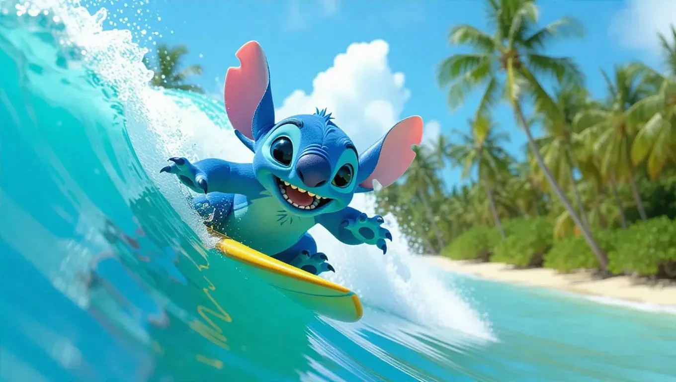 Generate playful AI visuals of Stitch surfing tropical waves amid palm trees. VivaGo.ai’s tools craft vivid, professional-grade images with a fun Hawaiian vibe, blending turquoise waters, vibrant beaches, and Lilo & Stitch charm effortlessly.