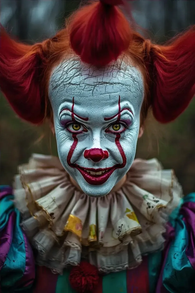 Generate a hyper-realistic AI image of a clowngirl blending weird beauty and dark elegance, packed with intricate details. Transform text prompts into striking visuals using Vivago.ai's advanced AI tools for professional-grade, surreal photography.