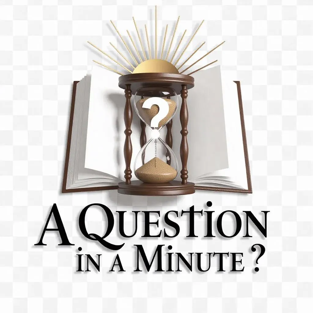 Create a premium 3D AI-generated logo with an open book radiating light beams, an hourglass centerpiece housing a bold question mark, and the phrase "A question in a minute." Ultra-high-resolution transparent background design for versatile use, blending creativity, symbolism, and professional branding in one striking visual identity.