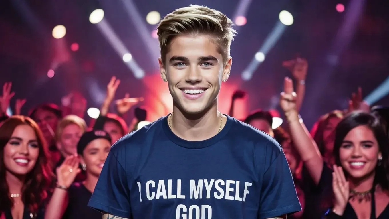 Generate striking AI images of Justin Bieber with a devilish smile, wearing a T-shirt proclaiming "I Call Myself God." Explore edgy fashion and bold statements with Vivago.ai's AI image generator. Transform text prompts into provocative, professional-grade visuals using cutting-edge creative AI tools.