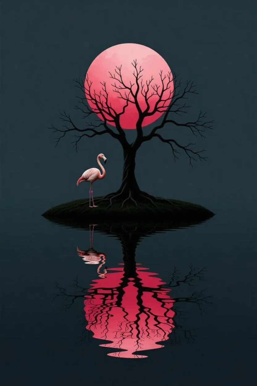 Create serene AI-generated art with a pink flamingo on a tranquil island, mirrored in still waters. Perfect reflections of a bare tree and rosy disc evoke melancholic harmony. Muted tones, symmetrical composition, and dark blue-gray contrasts highlight artistic depth. Ideal for evocative visuals blending nature, reflection, and ethereal ambiance.
