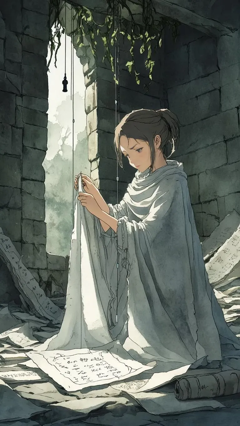 Create cinematic AI-generated anime art of a sacred hall with Ghibli-style ruins. Transform text prompts into ethereal scenes of an anime girl restoring the Shroud of the Voiceless, featuring muted watercolor visuals, ancient calligraphy, and ghostly ambiance. Craft professional-grade AI imagery with vivago.ai's text-to-image tools.