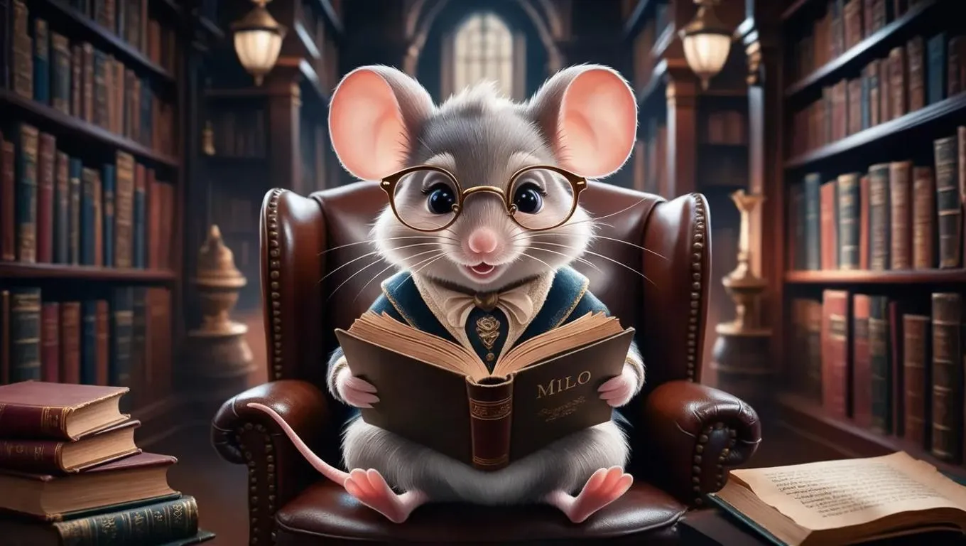 Meet Milo, a clever white-furred mouse in human attire and glasses, joyfully immersed in a captivating book at his library haven. AI transforms this whimsical tale into vivid visuals, blending anthropomorphic charm with intellectual curiosity. Explore AI image generation for storytelling, crafting lifelike characters and enchanting scenes that bring imaginative narratives like Milo's literary adventures to life.