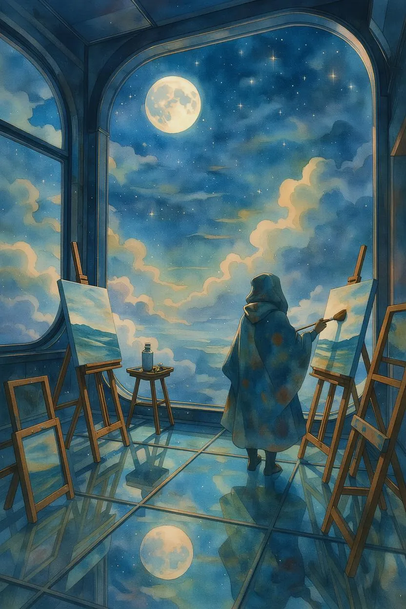 The moonlight train arrives at its final stop: an airy studio floating above clouds, where gravity bends gently. Easels hover mid-air, brushes suspended in motion, and unfinished paintings stretch into the sky like portals. The floor is translucent glass, revealing drifting stars below. A lone figure in a paint-splattered cloak adds strokes to a canvas that blends into the horizon. Light filters through floating windows in pastel hues, casting shifting watercolor shadows. The space feels timeless—half-dream, half-creation. A surreal fusion of watercolor softness and 3D precision, evoking the quiet reverence of art born in the sky.