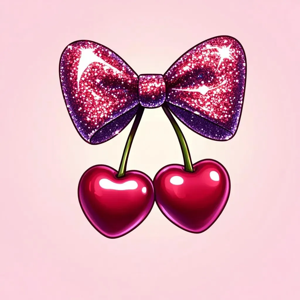 Create a Y2K coquette-style AI T-shirt design featuring a glittery bow with dangling heart-shaped cherries. Adorable, nostalgic aesthetic meets modern AI-generated art for trendy apparel. Perfect for cute, playful fashion statements with retro-futuristic charm and sparkling details. Customize your look with vivago.ai's creative tools.