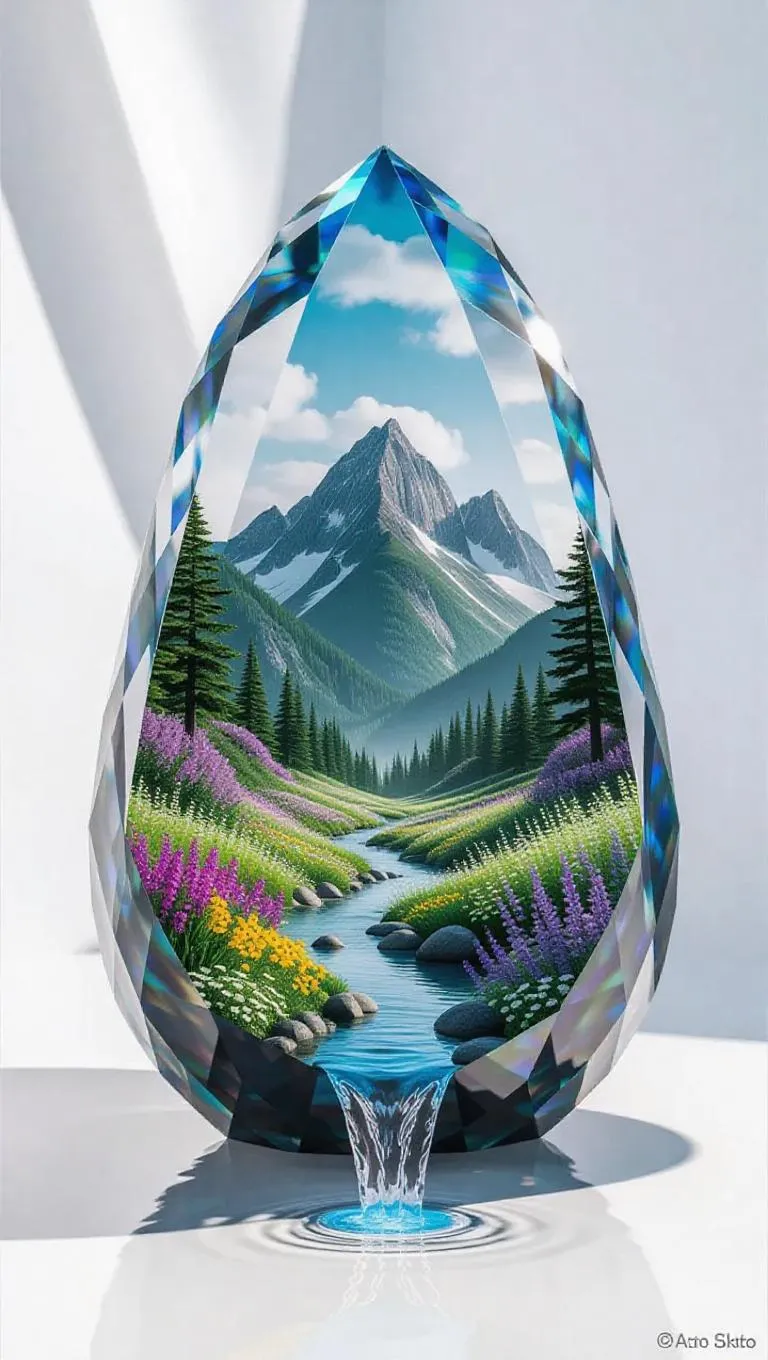 Create a hyper-realistic Fauvism-inspired AI artwork: a vibrant crystal structure encapsulating a tropical forest, spring flowers, and wildlife, bursting with bold, vivid colors. White minimalist background contrasts the crystal's vivid hues, with water flowing from it into a foreground stream. Explore surreal nature art blending crystal realism and modern Fauvist techniques for dynamic, colorful digital creations.