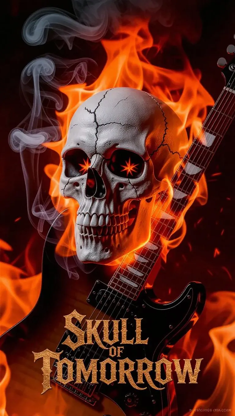 Generate AI-powered photorealistic art of a gothic skull engulfed in blazing flames with molten veins, alongside a smoke-wreathed electric guitar. Features ultra-detailed textures, cinematic lighting, and dynamic motion blur for intense rock-and-roll visuals. Transform prompts into vivid inferno scenes with ethereal "Skull of Tomorrow" bronze etchings using AI image generation tools.