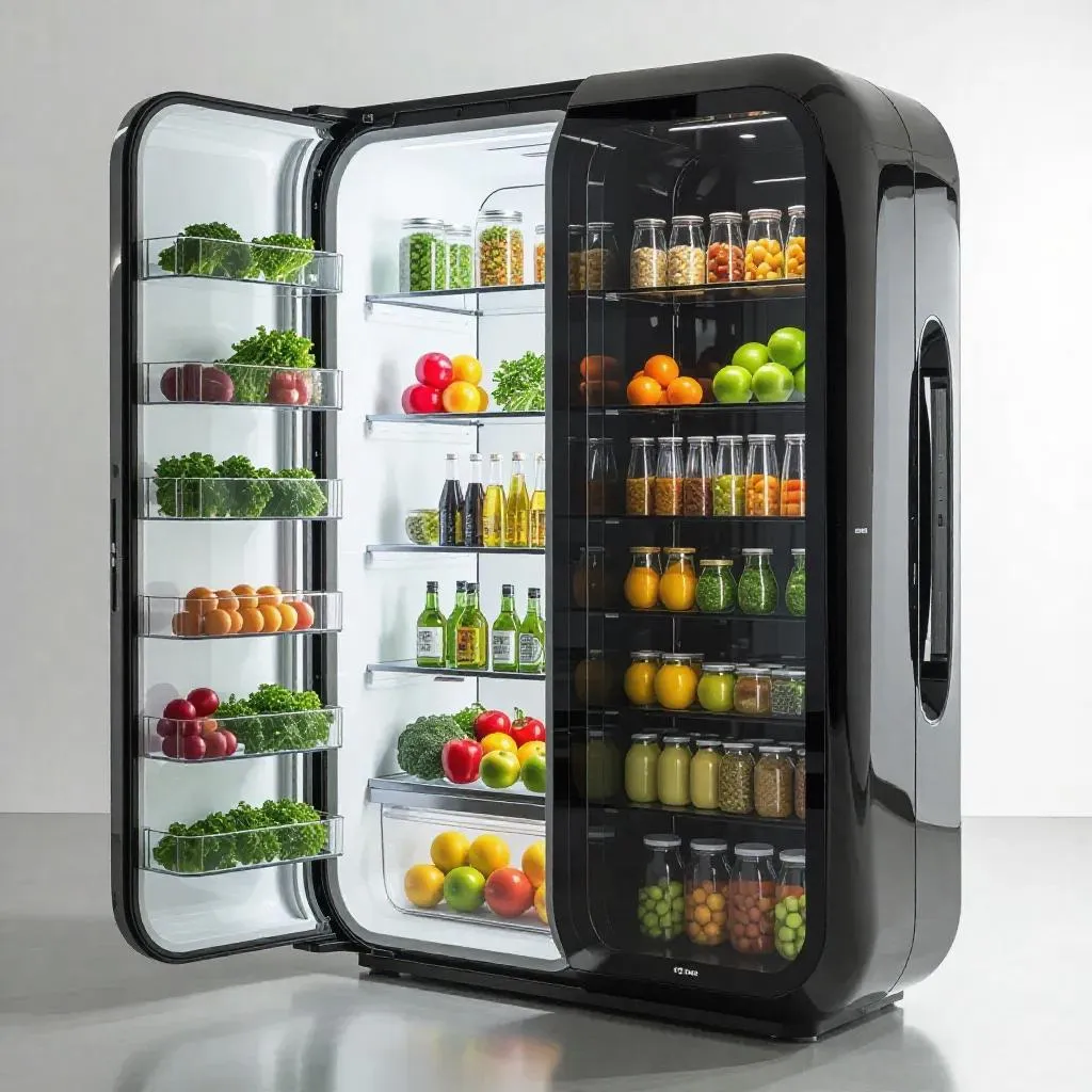 Transform your kitchen with an AI-powered smart refrigerator featuring transparent, glossy plastic doors. Showcase organized food storage, a vertical herb garden with built-in lighting, and visible compartments for fresh produce, drinks, and supplies. Streamlined design merges futuristic aesthetics with functional innovation, optimizing visibility and freshness for a modern, efficient culinary experience.