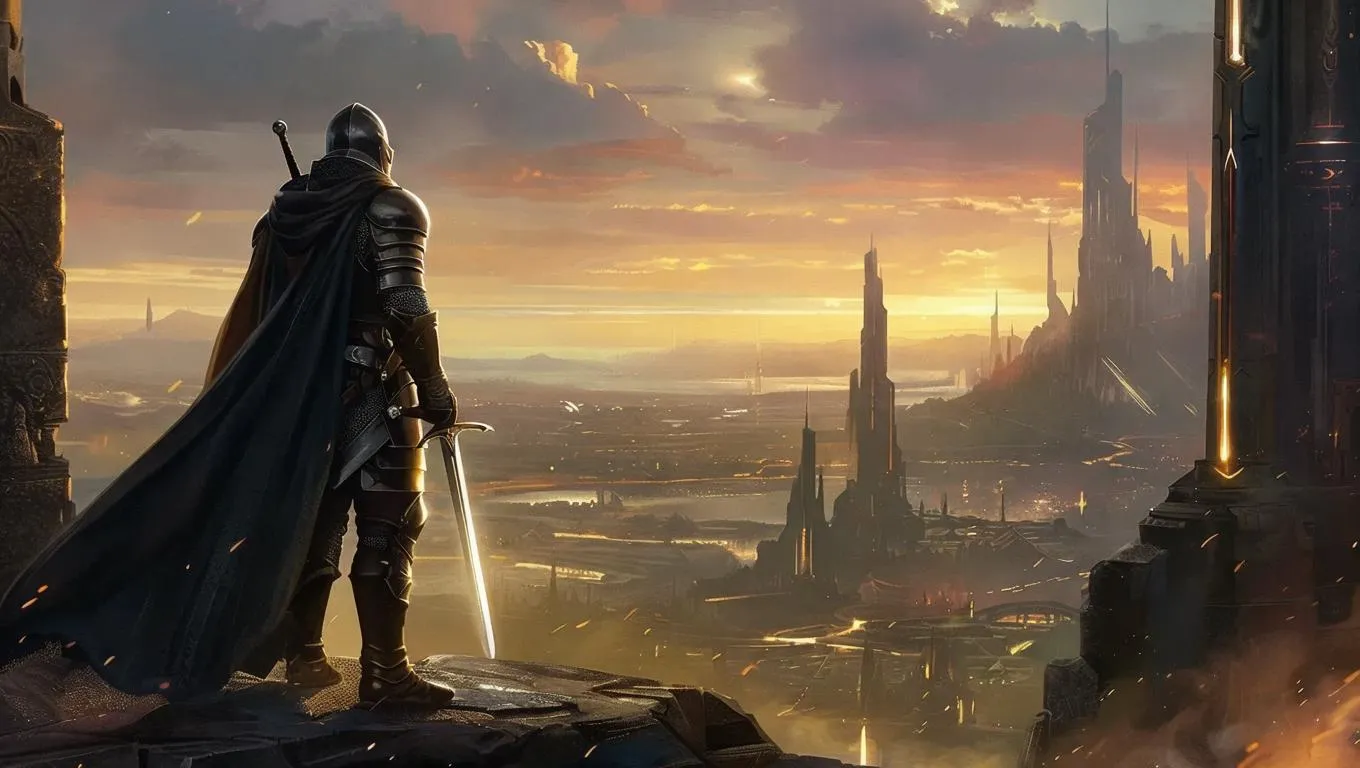 Generate epic AI art of a swordsman gazing into oblivion with VivaGO's AI image generator. Create dramatic post-apocalyptic visuals featuring intense atmosphere, dynamic composition, and symbolic storytelling elements. Transform text prompts into stunning fantasy scenes for concept art, digital illustrations, and immersive world-building projects.