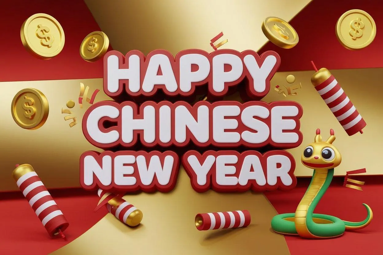 Create a vibrant 3D "Happy Chinese New Year" banner with AI: red text, golden music symbols, festive firecrackers, and a playful snake on a gold-red gradient. Perfect for Lunar Year celebrations, social media, or digital greetings. Transform ideas into eye-catching designs instantly using Vivago.ai's AI tools.