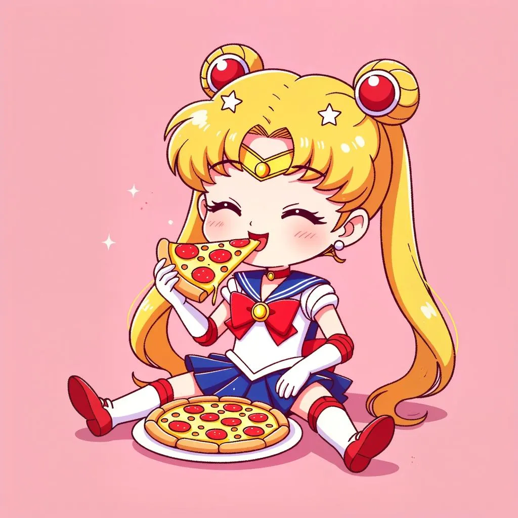 sailor moon eating pizza, relax, chibi style, simple character illustration, line art, minimalist, cute, bold line and solid color,