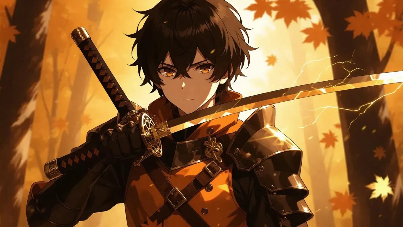 Generate a striking 2D Mexican anime character with autumn-themed armor, leather accents, and a mystical katana featuring a crystallized orange blade. AI-powered tools bring vivid details like gold lightning effects, dark brown-orange eyes, and wavy jet-black hair to life for dynamic, professional-grade anime visuals.