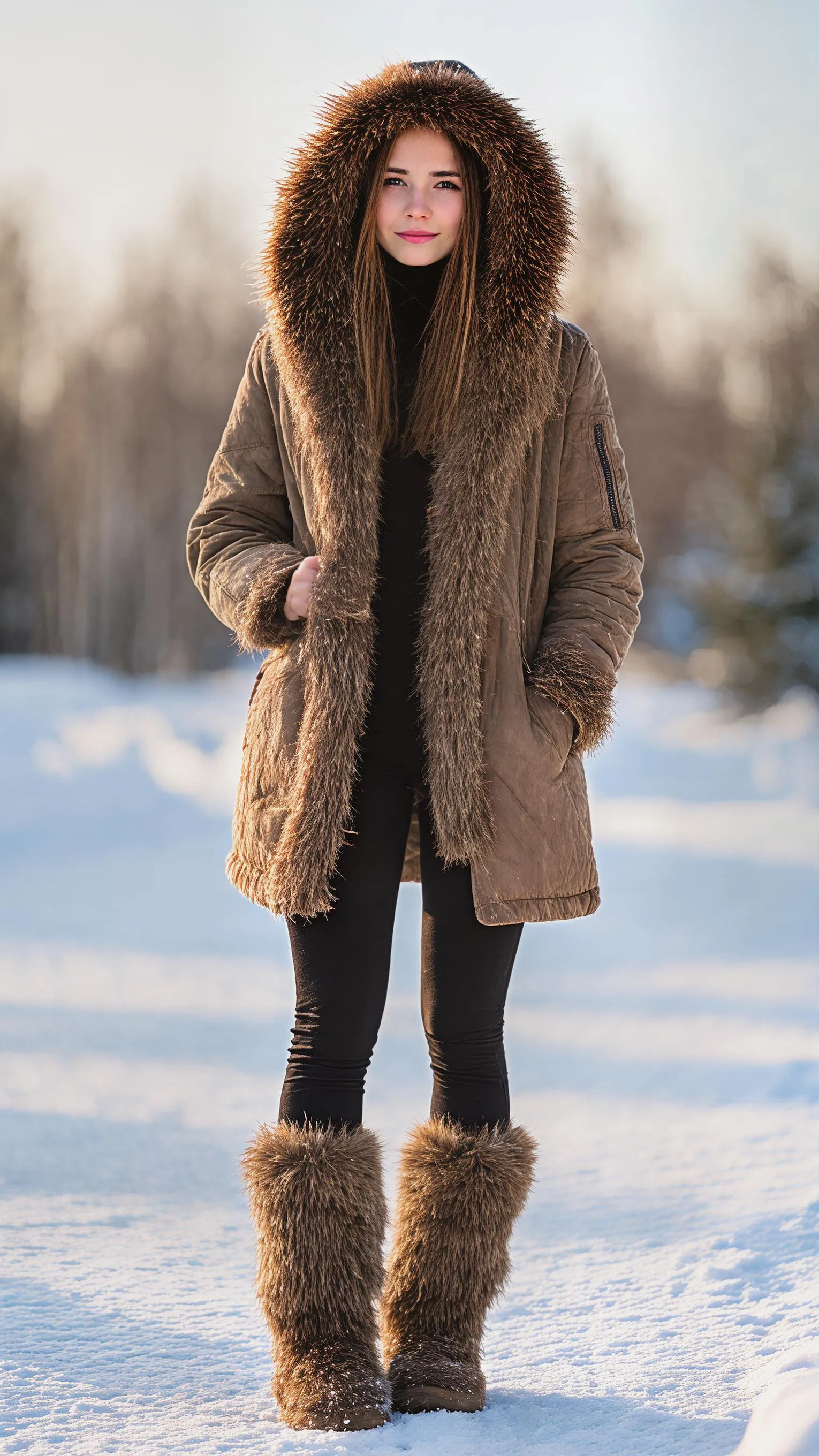 Generate stunning AI images of an attractive 21-year-old European girl in a snowy landscape. Sunny day setting features her in chic winter attire: fur boots, black leggings, brown fur-lined jacket, and hood. Create hyper-realistic scenes effortlessly with Vivago.ai's AI image generator.