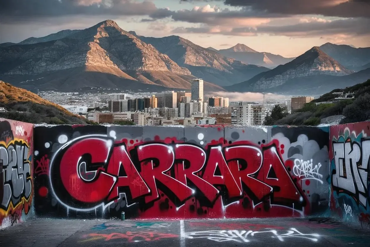 Create bold graffiti mountains and skylines with Vivago.ai's AI spray paint effects. Generate dynamic red, black, and grey street art featuring crisp white outlines, custom text like "CARRARA," and urban textures. Elevate designs with AI-powered precision for striking, edgy visuals. Perfect for urban-themed projects or branding.