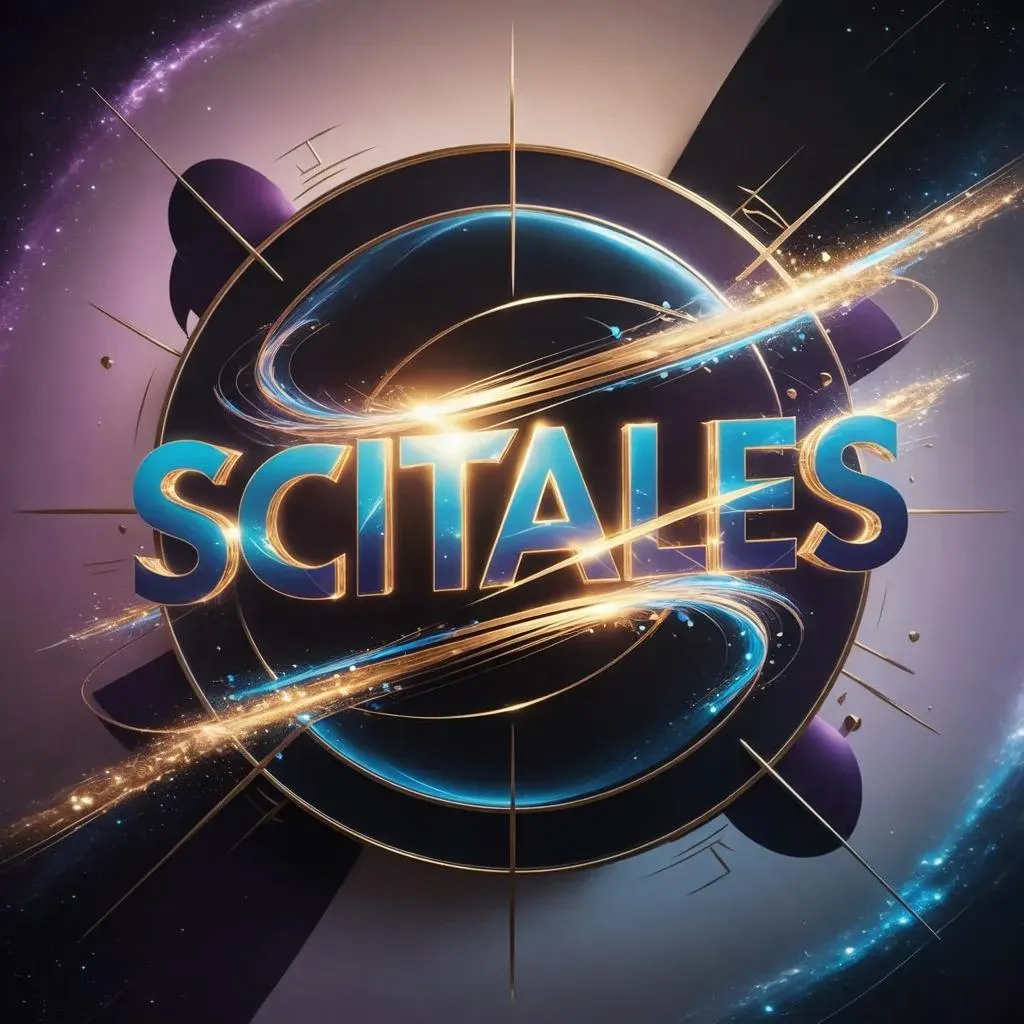 Craft a bold, futuristic YouTube profile image for SciTales with glowing blue-gold gradient text. Abstract light trails, geometric shapes, and cosmic purple-blue-gold backgrounds create minimal depth. Optimized for circular layouts, this AI-generated design ensures originality and memorability. Elevate your channel branding with vivago.ai's advanced creative tools for striking, professional visuals.