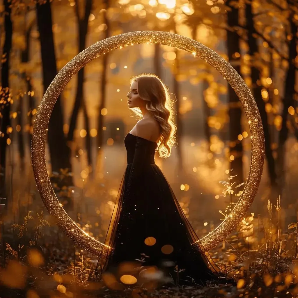 Create a stunning AI-generated portrait of an elegant woman in a black dress amidst a golden autumn forest. Vivago.ai combines cinematic fashion photography, ethereal light, and bokeh effects with fantastical elements for dreamy, professional-grade visuals. Transform concepts into nostalgic, artistic imagery using AI-powered precision and warm, whimsical compositions.