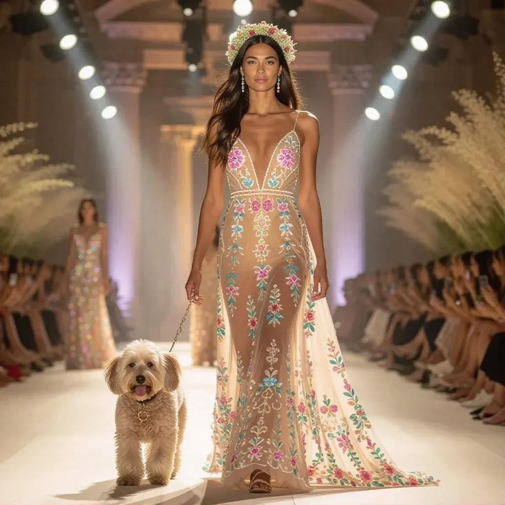 Paris fashion runway merges ancient Greek Easter with haute couture: a model & Kokoni dog in pastel-flowing dresses adorned with Hellenic embroidery. Delicate wildflower crowns evoke timeless elegance, blending serene Hellenic motifs with modern style. Celebrate cultural fusion in haute couture—where Greek key patterns meet Parisian runway glamour.