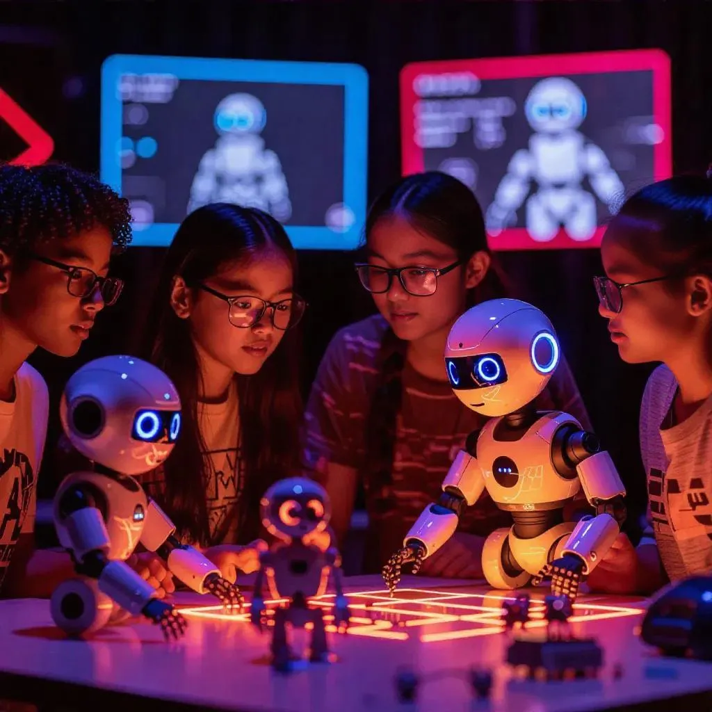 Explore AI-powered robotics in education with this vibrant futuristic classroom scene. Diverse students collaborate, programming robots and experimenting with high-tech tools. Highlights hands-on learning, innovation, teamwork, and creativity through interactive displays and advanced devices. Captures dynamic STEM education's excitement, blending cutting-edge technology with inspiring, collaborative environments for next-gen skill development.
