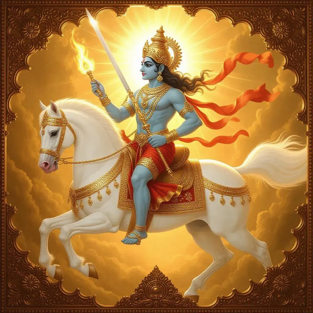 Majestic Kalki Avatar, Lord Vishnu's divine incarnation, rides a white horse wielding a flaming sword to vanquish evil in a celestial realm. Golden light, intricate armor, and traditional Indian miniature artistry blend vibrant colors and fine details. Dynamic composition captures serene power, symbolizing renewal through destruction. AI transforms mythology into vivid, rule-of-thirds visuals for professional-grade creative storytelling.