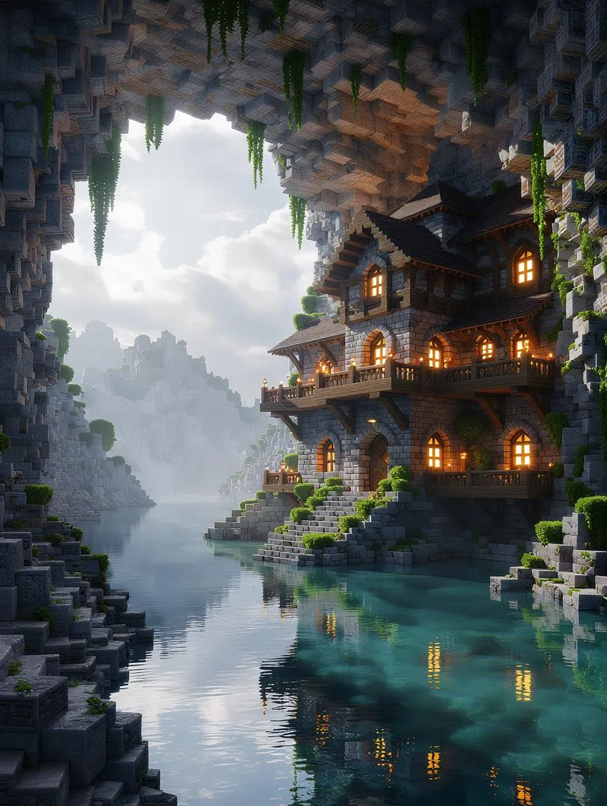 Discover a hyper-realistic Minecraft-inspired AI-generated scene: tranquil voxel-textured lake mirrors a cavernous stone-and-dark-oak mansion with glowing lanterns. Medieval symmetry meets survival creativity under moss-draped cave ceilings, dramatic shadows, and serene solitude. Crafted with cinematic realism, every block showcases detailed textures, blending digital geometry and natural ambiance for immersive architectural wonder. Perfect for AI-powered creative visuals.