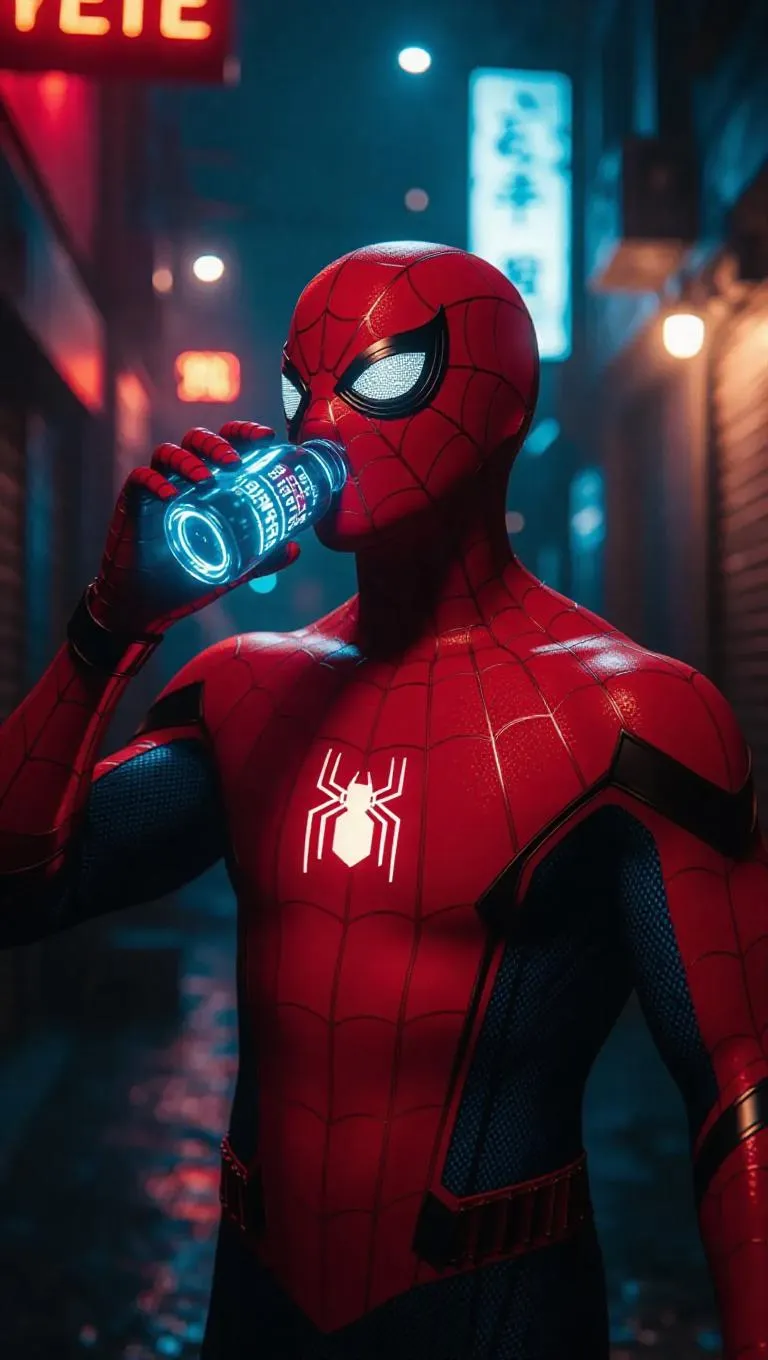 Step into a cyberpunk alley with AI-generated Spider-Man gripping a neon-glowing bottle. Vivago.ai crafts cinematic grit: sci-fi lighting, reflective mask details, smokey atmosphere, and hyper-realistic textures. Explore AI effects for glowing liquid dynamics, bokeh depth, and film grain—transforming prompts into 4K superhero surrealism.