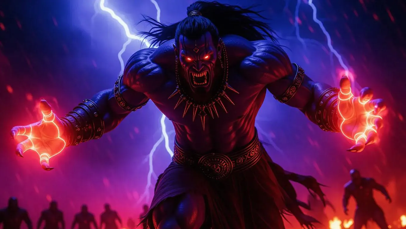 Ultra-realistic 8K AI art of a demonic warrior with glowing red eyes, arcane energy hands, and ritual tattoos descending through stormy skies. Cinematic battle scene features swirling fiery clouds, terrified soldiers below, photorealistic textures, dramatic shadows, and mythological intensity. AI-generated dark fantasy artwork with slow-motion feel, high-contrast lighting, and cinematic color grading for epic film still impact.
