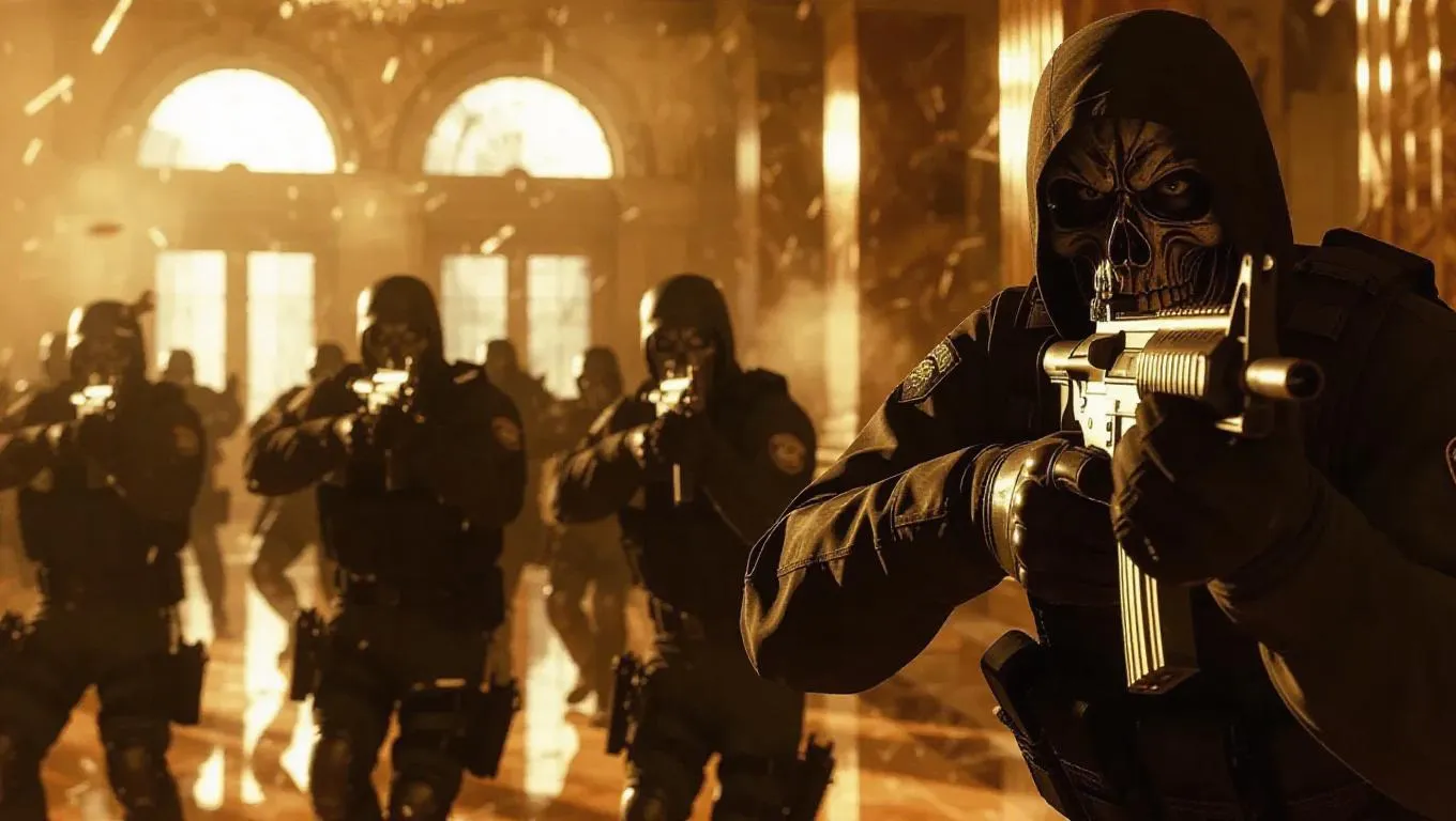 AI-generated image prompt: GTA-style chaotic bank heist with masked robbers, police shootout, shattered glass, smoke-filled chaos, wide-angle dynamic shot, motion blur, and intense lighting effects. Create action-packed, cinematic visuals with AI-powered precision.