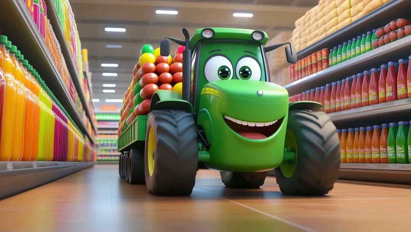 Generate a whimsical 3D cartoon tractor with vibrant green hues, expressive eyes, and a cheerful smile, zooming through supermarket aisles. The tractor pulls a trailer overflowing with juices and packaged sausages. Create vibrant, playful AI visuals for ads or content with VivaGo's AI generator.