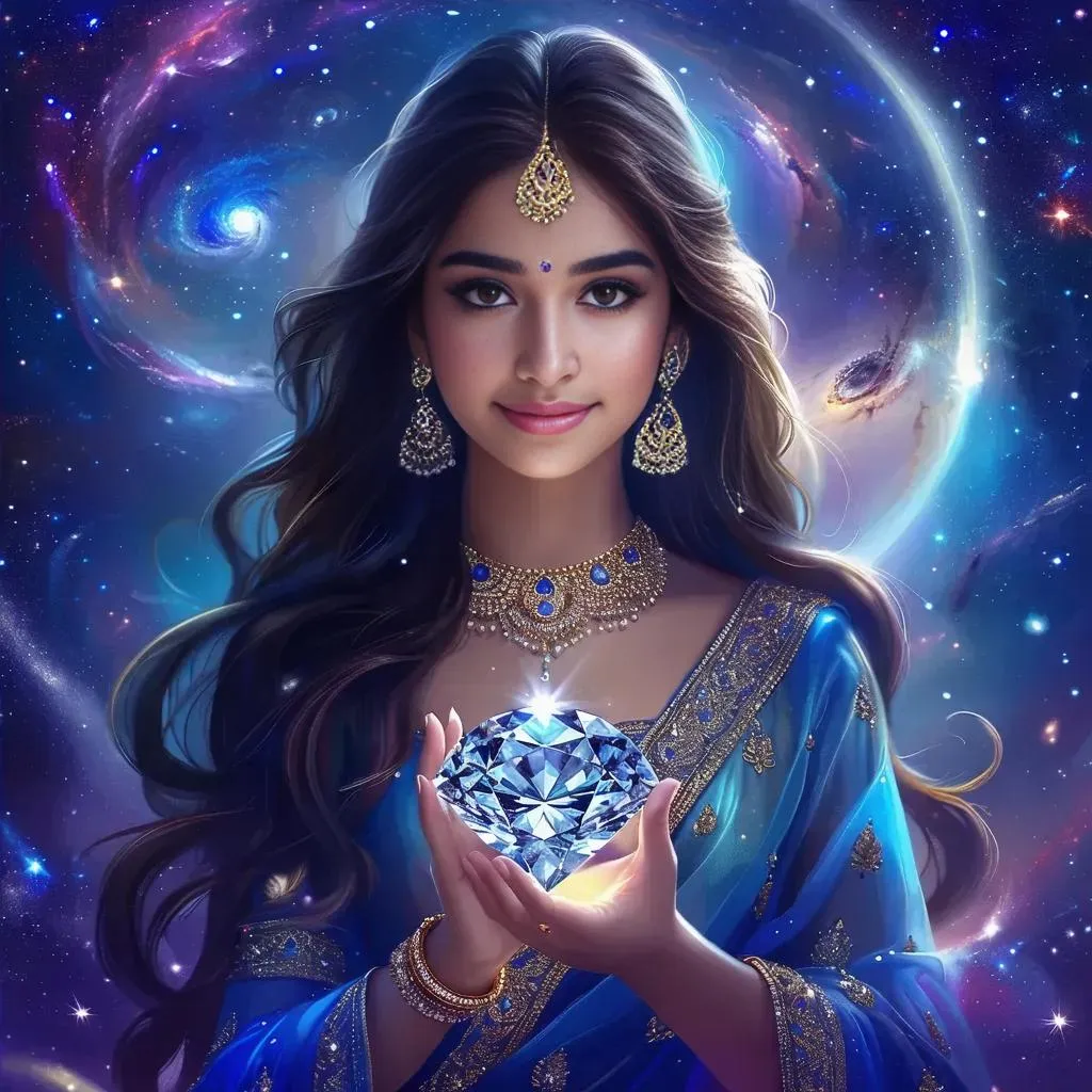 Generate stunning AI images of a 25-year-old Indian goddess princess with long flowing hair, holding a glowing crescent moon. Achieve photorealistic 8K cinematic visuals with cosmic backgrounds, dramatic lighting, and lifelike details using advanced AI tools. Perfect for fantasy art, digital storytelling, or creative projects demanding ultra-realistic, full-body character portrayals.