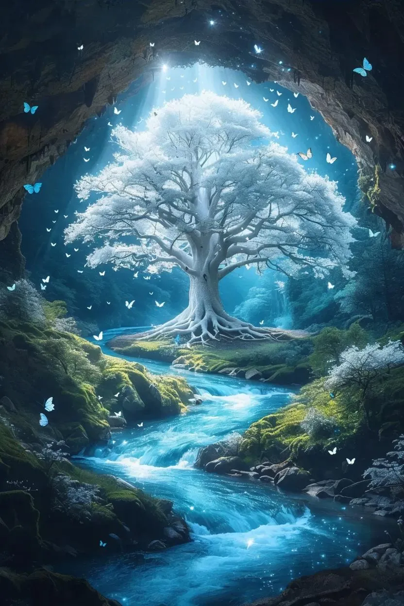 Craft a magical AI book cover with a majestic white tree atop a forested hill, encircled by a sparkling blue river inside a luminous cave. Sunlight cascades from above, illuminating fluttering butterflies—Vivago.ai transforms your vision into enchanting, professional-grade visuals using advanced AI image generation and curated effects.