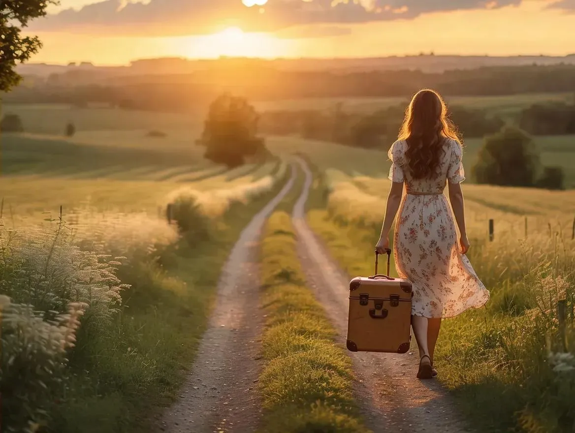 Create a romantic countryside scene with AI-generated imagery: golden hour lighting illuminates a flowing floral dress and vintage suitcase on a dirt road. Achieve cinematic visuals with ethereal moods, shallow depth of field, and warm nostalgic tones. Transform your vision into professional-grade digital photography using Vivago.ai's AI effects and editing tools.