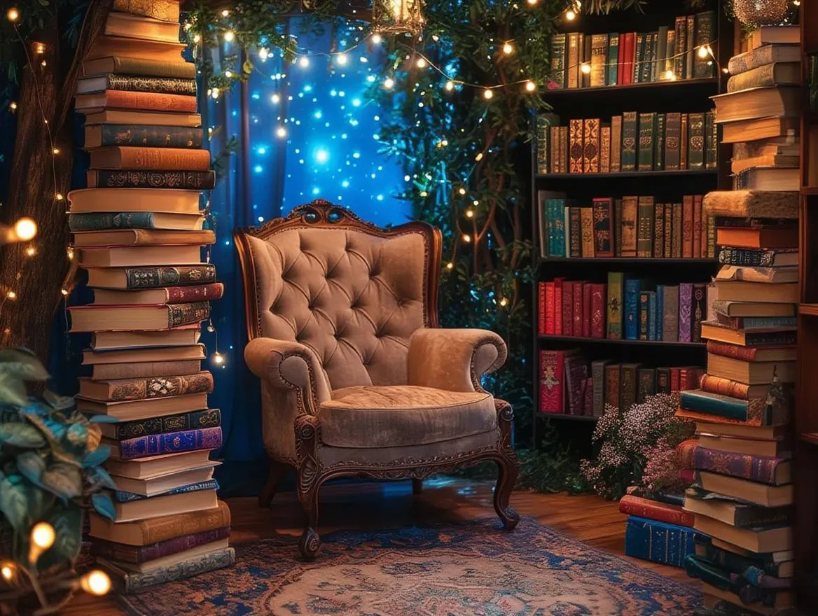 Step into an AI-generated fantasy scene with a whimsical storytelling corner. Cozy up in a vintage armchair surrounded by enchanted fairy tale books and twinkling lights. Explore AI-powered creative tools to bring magical narratives to life through vivid imagery and ethereal ambiance.