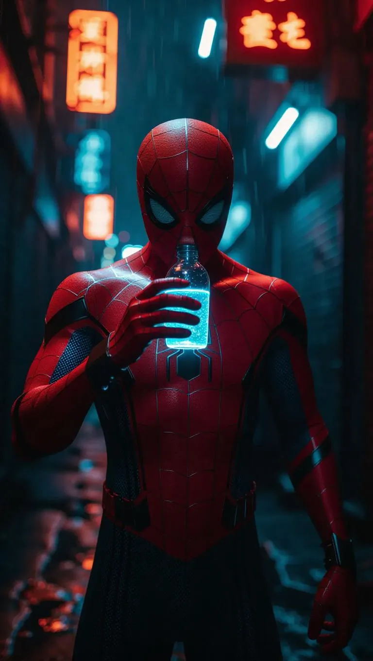 A muscular male Spider-Man stands alone in a cyberpunk alley, surrounded by neon-lit walls and rising mist. He lifts a small glowing bottle to his mouth — the liquid inside pulses with intense blue-green light, casting reflections across his mask and suit. As he drinks, the radiant fluid glows even brighter, illuminating his chest and fingers through the red web-patterned fabric. The background fades into soft bokeh while the glowing drink becomes the focal point. Cinematic atmosphere, gritty realism, high contrast, film grain, soft smoke, 4K.