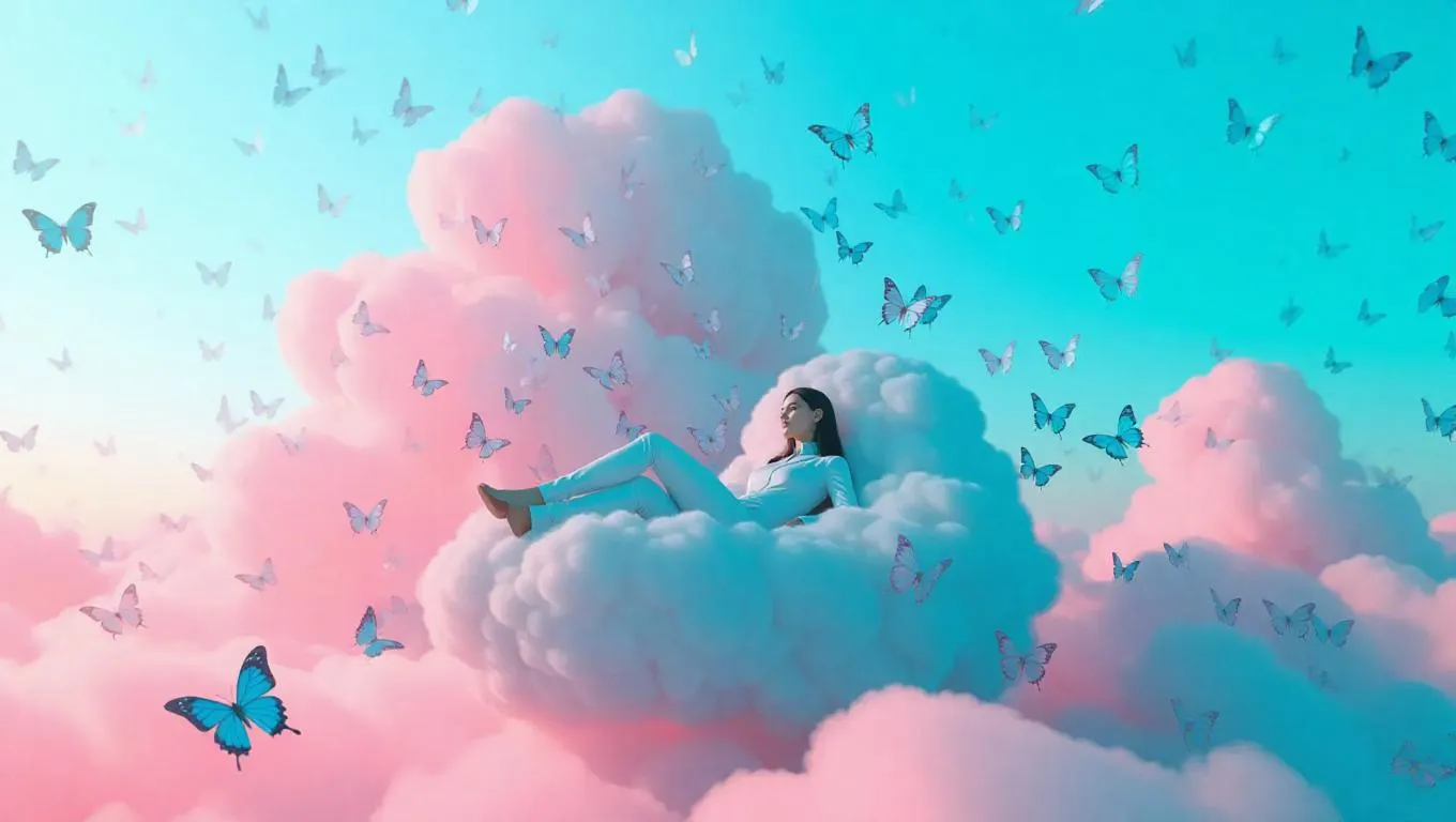Suspended amidst an ethereal, cotton-candy-hued cloudscape, a lone, regal figure reclines on a wispy, cumulus throne, surrounded by fluttering, iridescent butterflies and a tangled, gossamer veil of cloud-strands, turquoise and rose-hued mist swirling, curling around their majestic form, set against a brilliant, cerulean expanse, viewed through a dreamy, soft-focus lens, surrealismo fantascientifico.