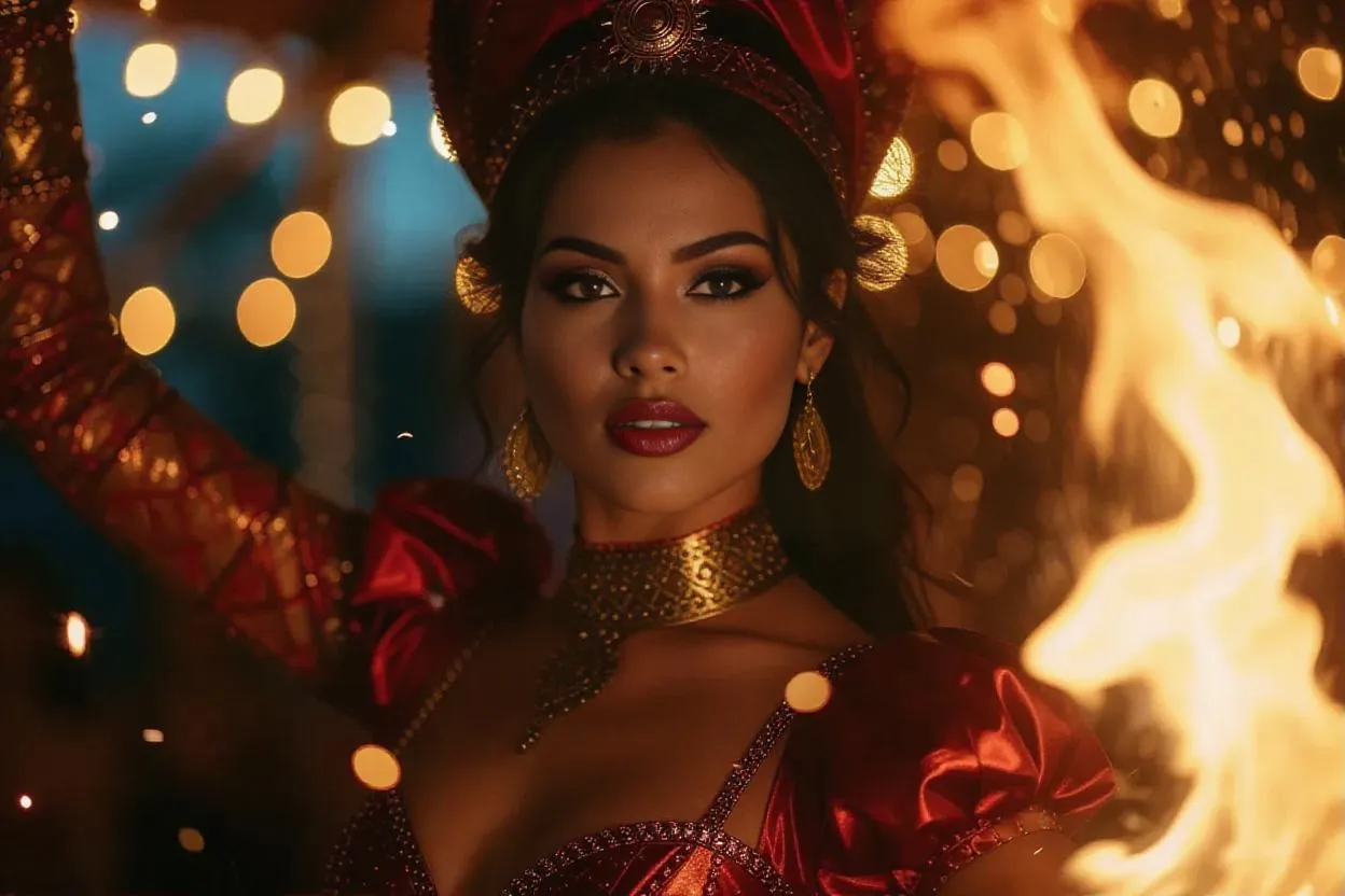 Vibrant AI-generated image of a beautiful Mexican woman in a fiery circus performance, blending steampunk elements like gears and brass accents. Dramatic high-contrast photography highlights her strength, elegance, and passion during a fire show. Perfect for artistic storytelling, creative visuals, and immersive AI-powered steampunk-inspired content.