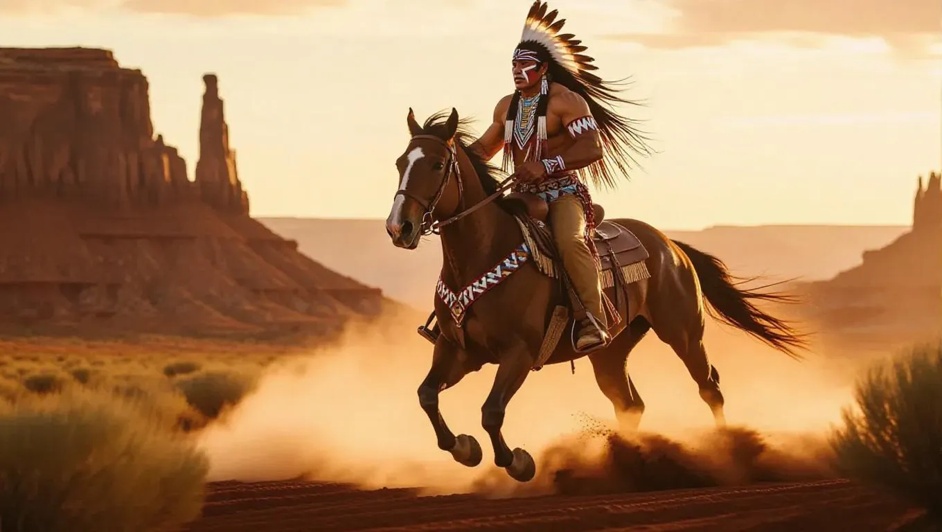 Vivid AI-generated imagery of a Native American warrior galloping on a chestnut stallion through Wild West canyonlands. Features intricate beadwork, eagle feathers, war paint, and golden-hour lighting. Captures raw motion, cultural heritage, and rugged landscapes with Canon EOS R5-style precision – swirling dust, storm clouds, crimson cliffs. Ideal for Western-themed AI art blending dynamic action and historical authenticity.