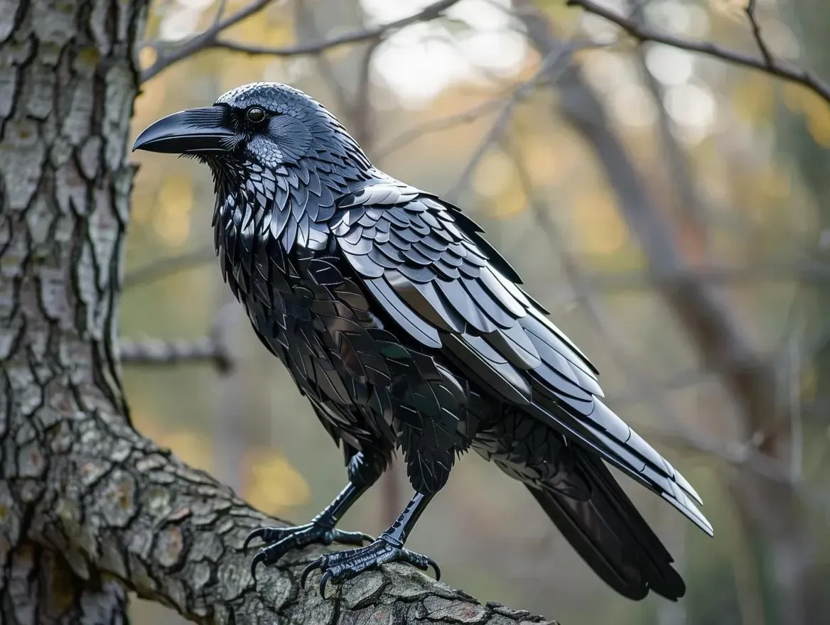 Generate a striking metal chrome raven AI-generated image with intricate metallic textures, perched on a rustic tree branch. Explore surreal wildlife imagery blending nature and futurism. Create futuristic avian art using advanced AI tools for hyper-realistic visual effects.