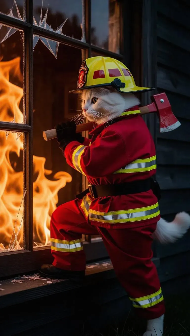Vivid AI-generated art captures a heroic anthropomorphic firefighter cat in dynamic action. Clad in red gear, wielding an axe, it confronts a blazing house with cracked windows. Dramatic side-view lighting highlights flames, smoke, and fiery reflections, intensifying the rescue scene. Perfect for AI-powered visuals blending fantasy, courage, and high-stakes moments in striking detail.